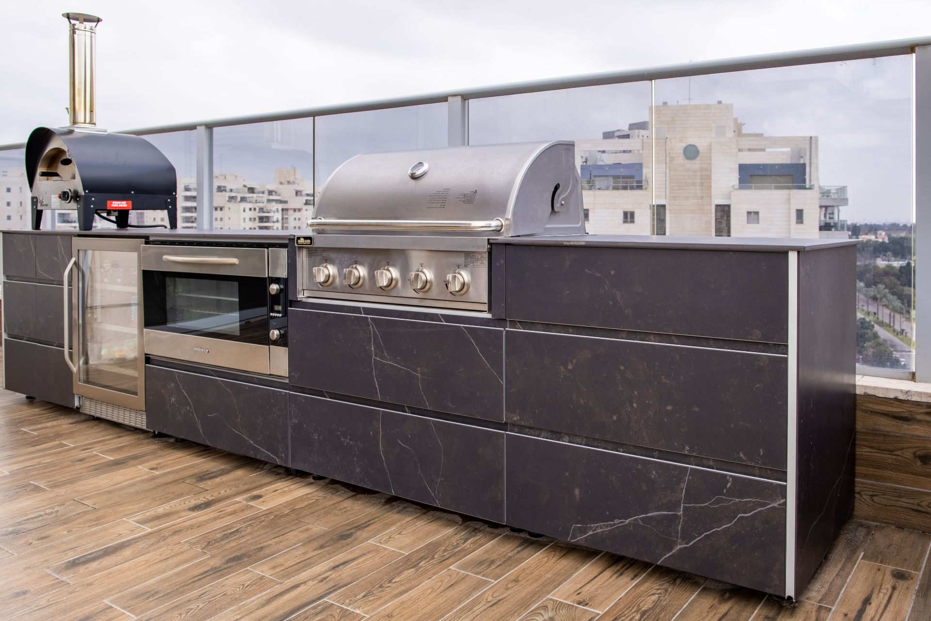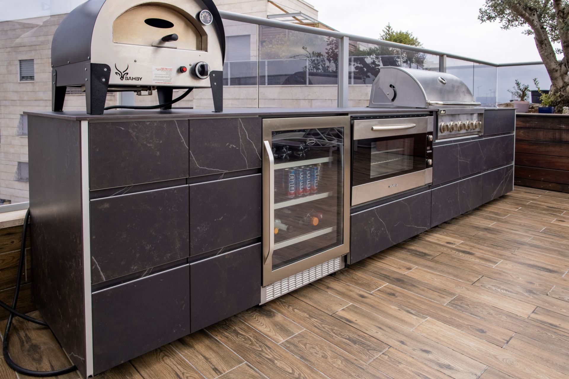 מטבח מפואר עשוי אלומיניום ומחופה בגרניט פורצלן דקטון קליה ומאובזר בגריל איכותי עם 5 מבערים, תנור אפייה רחב, מקרר עם חזית זכוכית וטאבון איכותי.