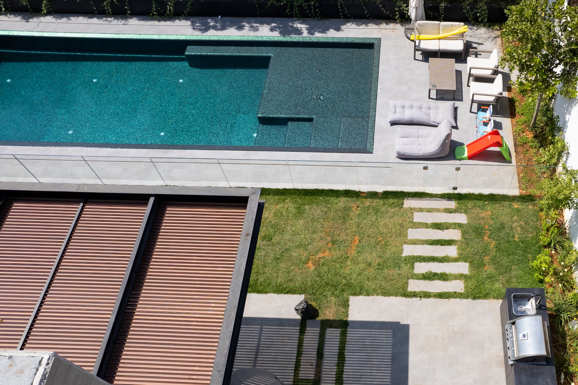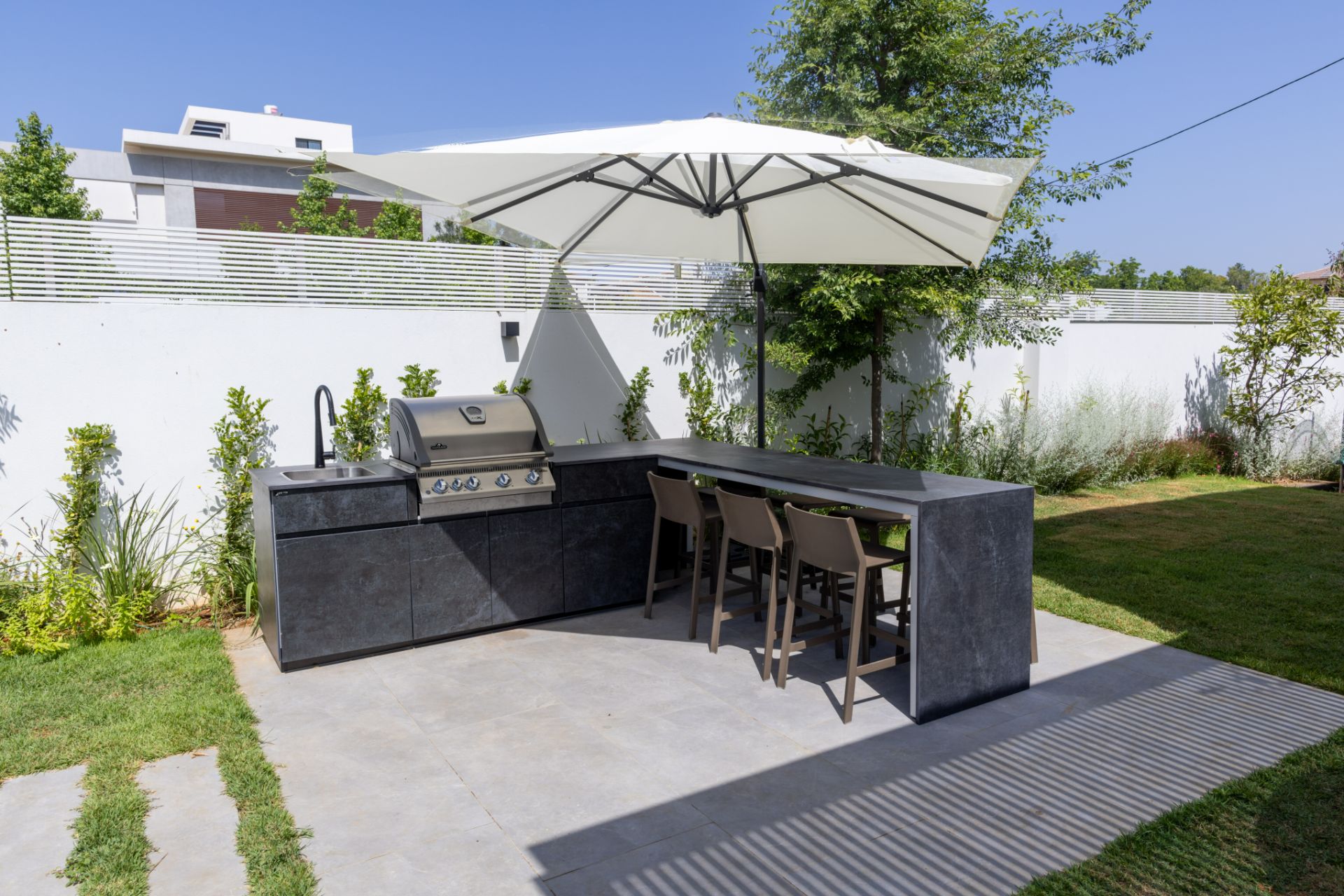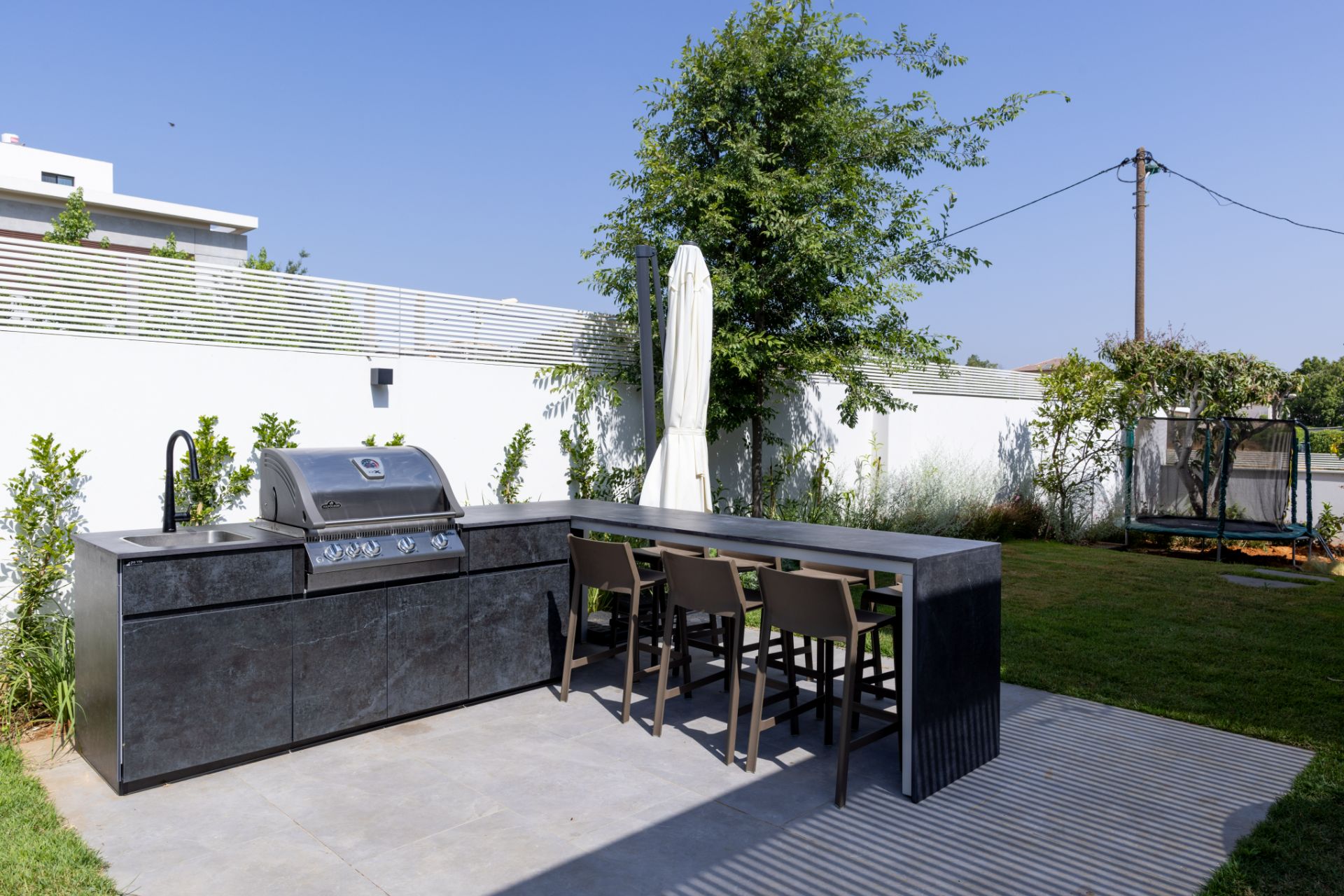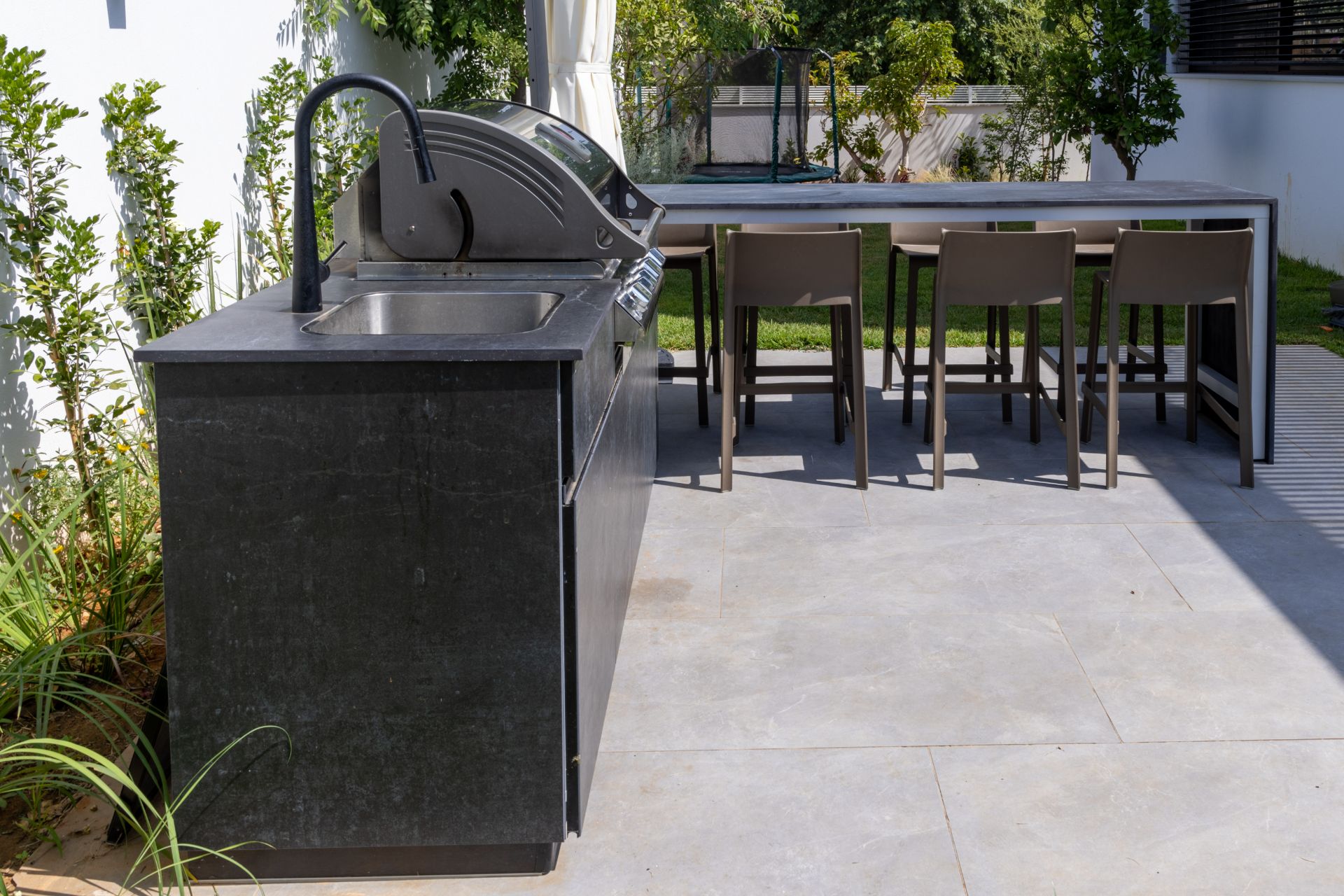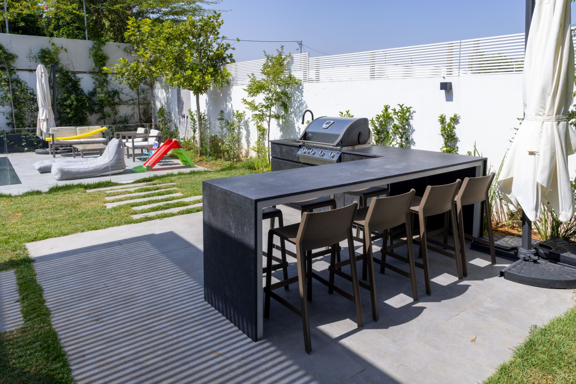 מטבח אי פינתי בשילוב בר ישיבה מחופה כולו בגרניט פורצלן, מצוייד בגריל איכותי, כיור וברז