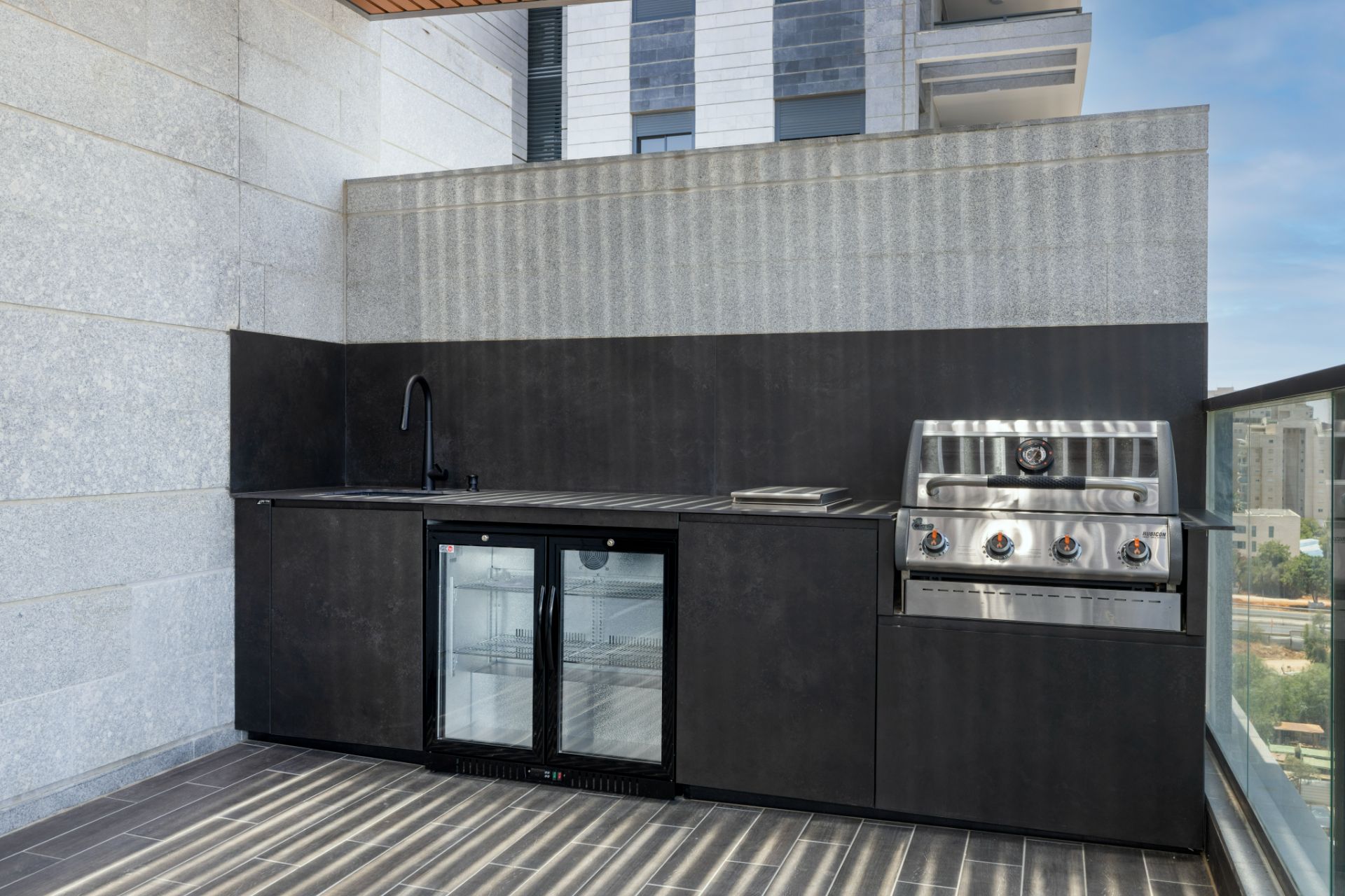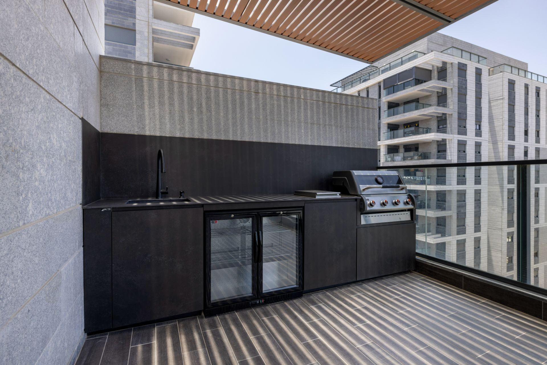 מטבח מרפסת שחור ומאובזר בגריל איכותי, כירת גז, מקרר דלת כפולה, כיור וברז