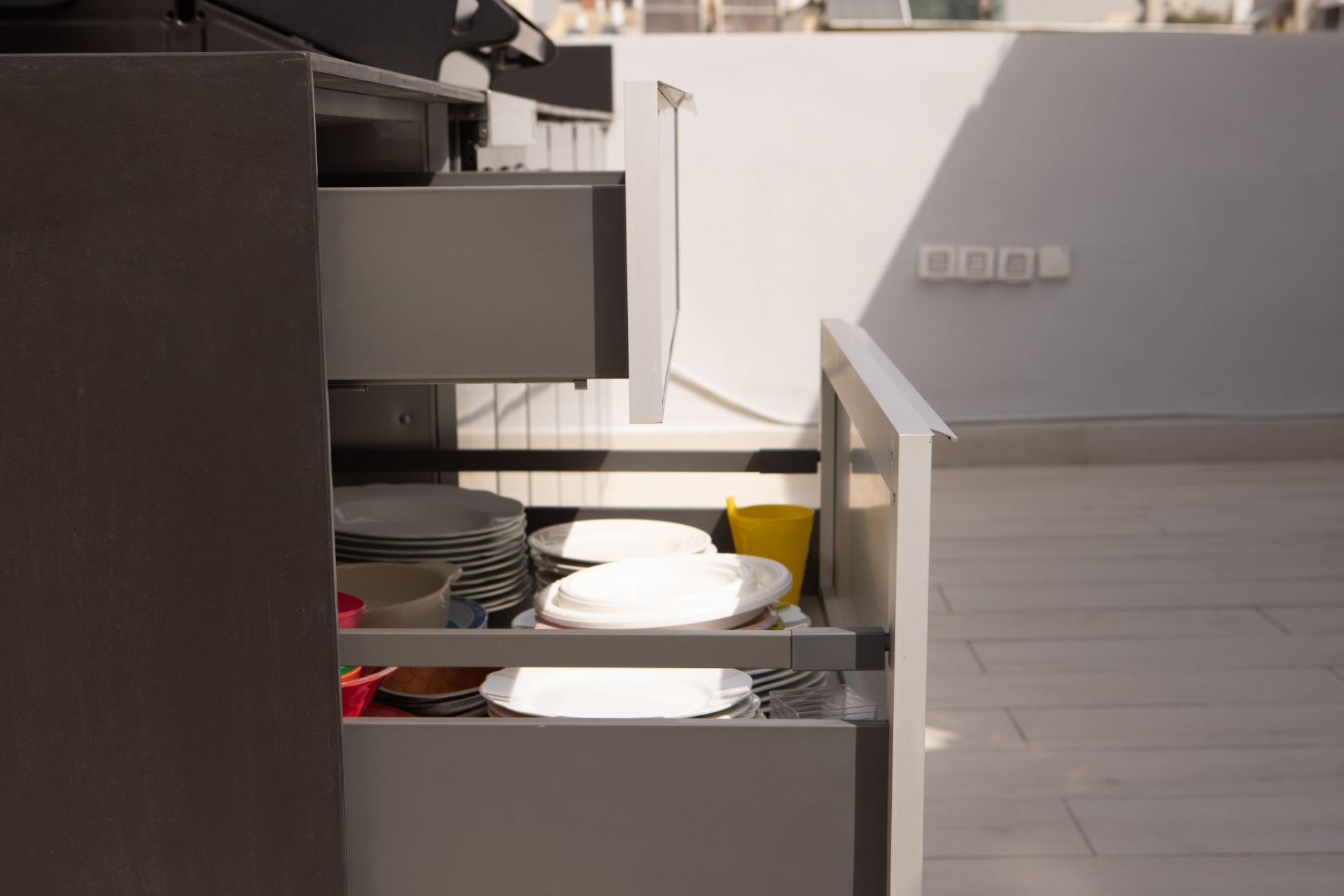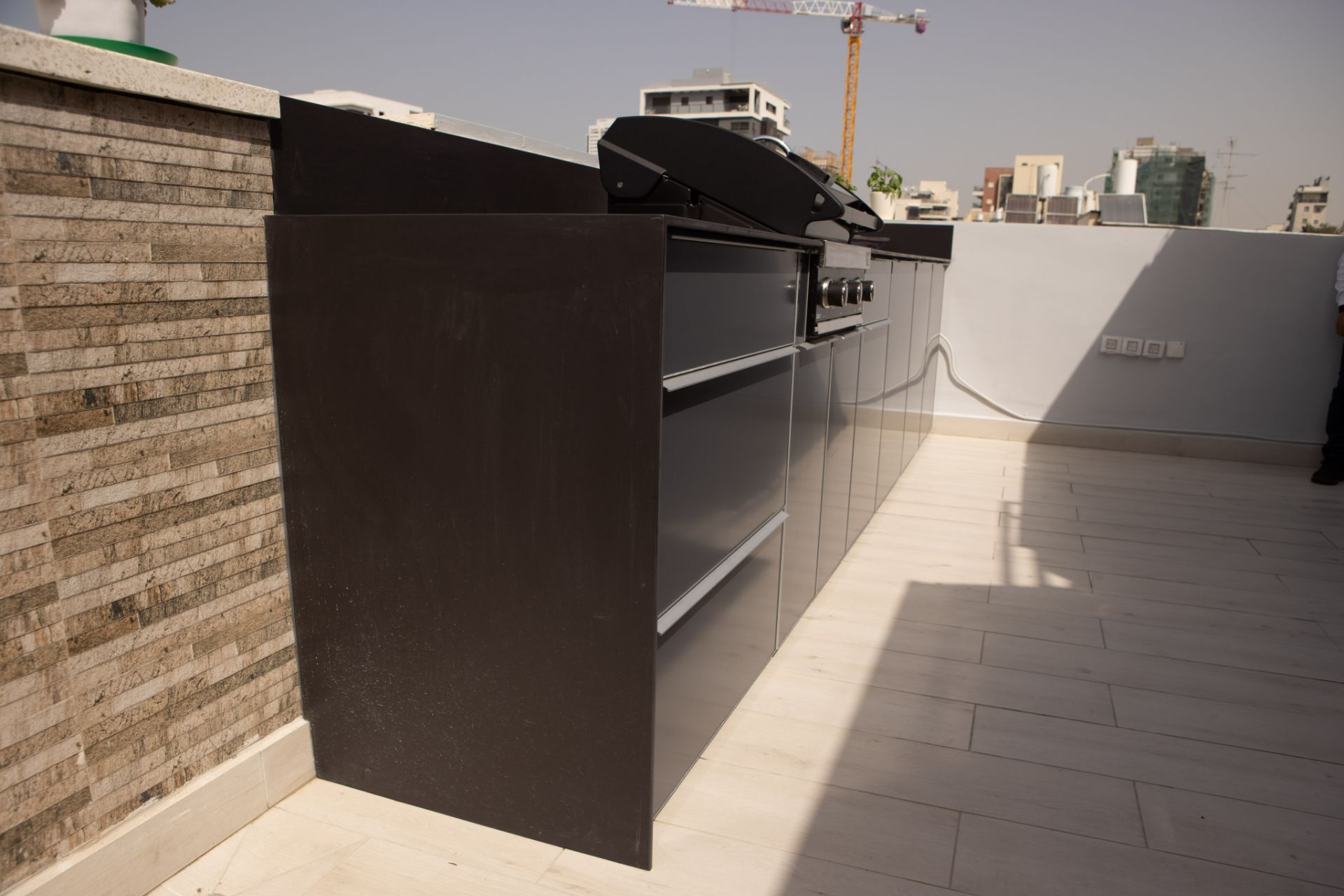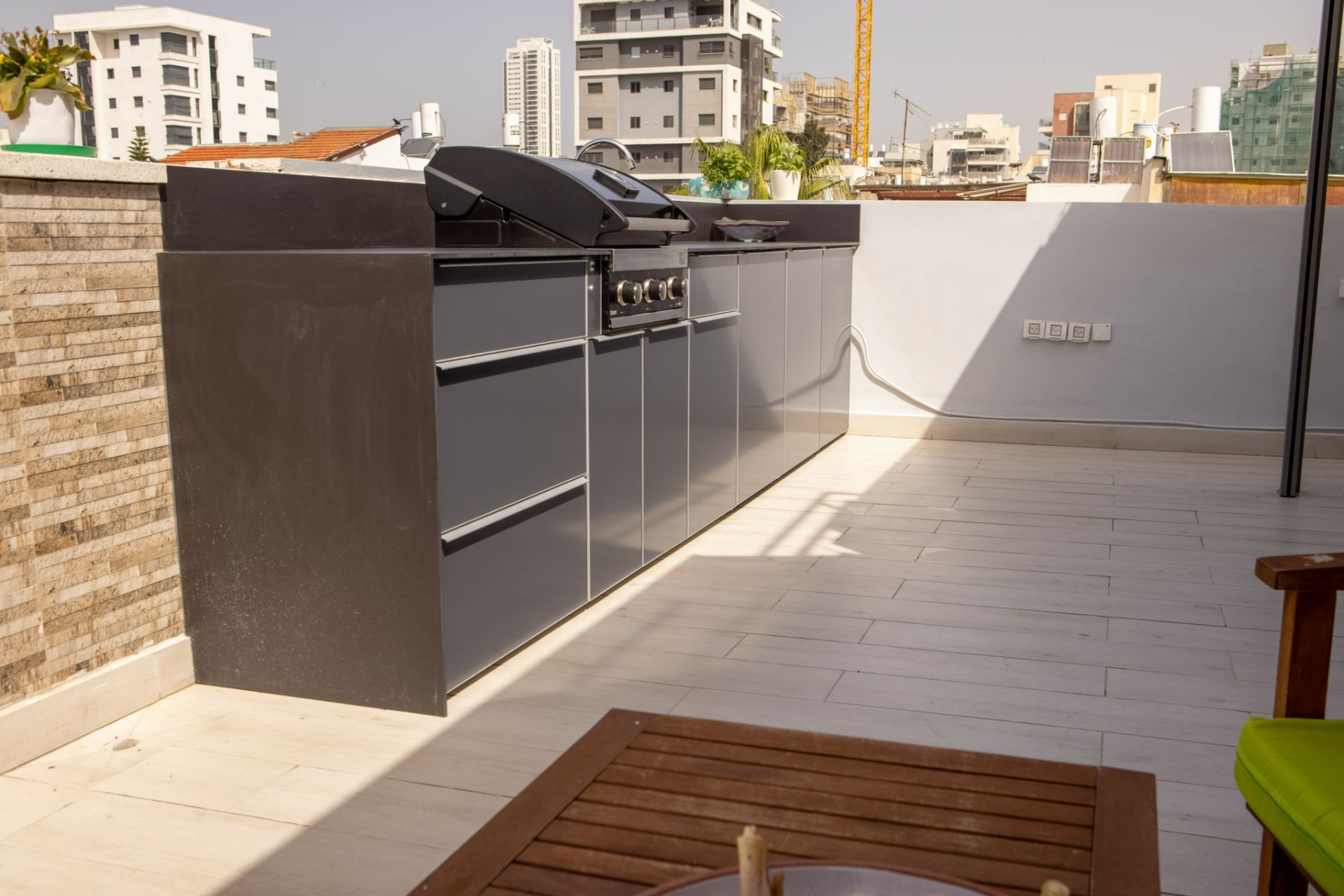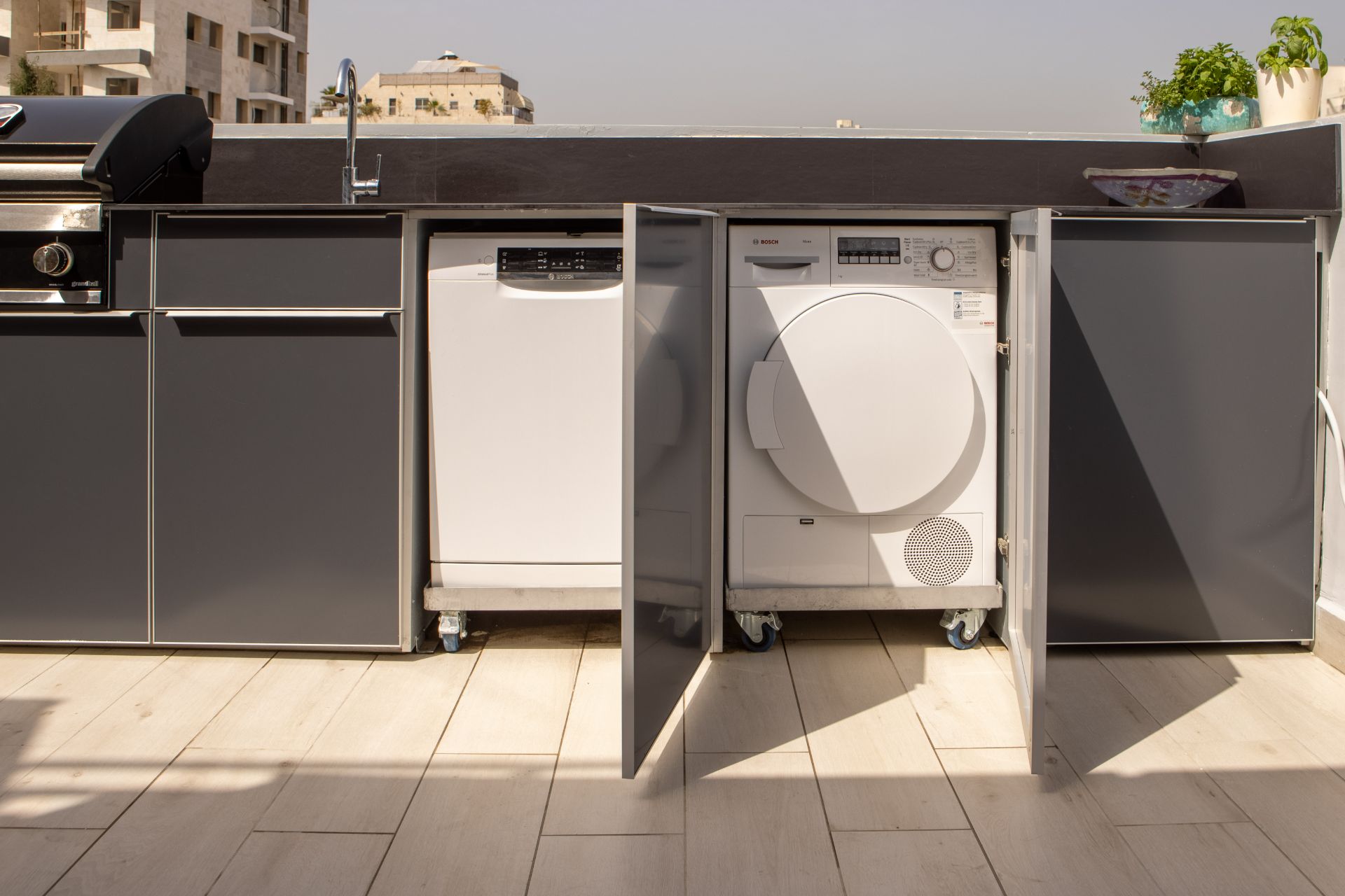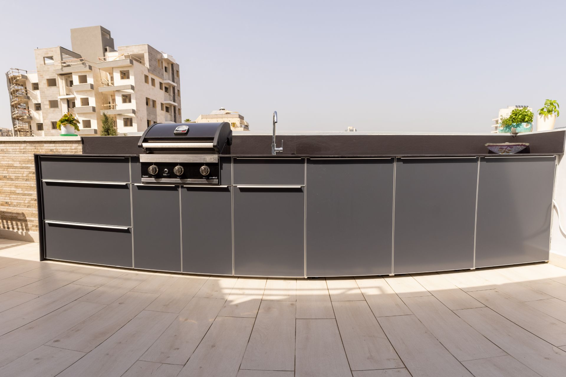 מטבח גדול עשוי אלומיניום בחיפוי דקטון, 3 מגירות נשלפות, אחסון למכונת כביסה ומייבש, גריל 3 מבערים, כיור וברז נשלף, תוספת ידיות לדלתות ולמגירות.